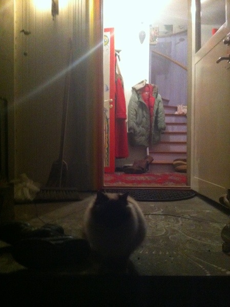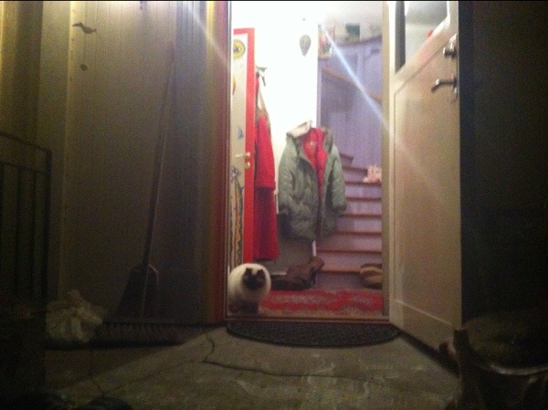 Först av allt… Ut i mörkret! Hon är borta länge. Vem vet kanske knep hon sig en mus.