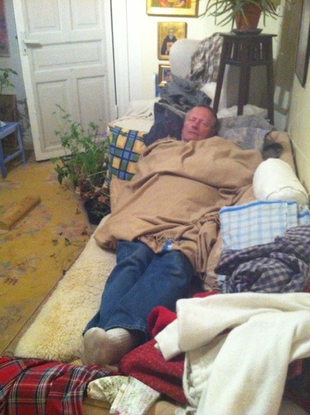 Vi fick hem vår skulptur, vi är lyckliga. Packningen har fått stått ute över natten. Man kan ju få med sig objudna gäster hem… Kackelackor och spindlar… För säkerhets skull skakar jag av allt ute i kylan.