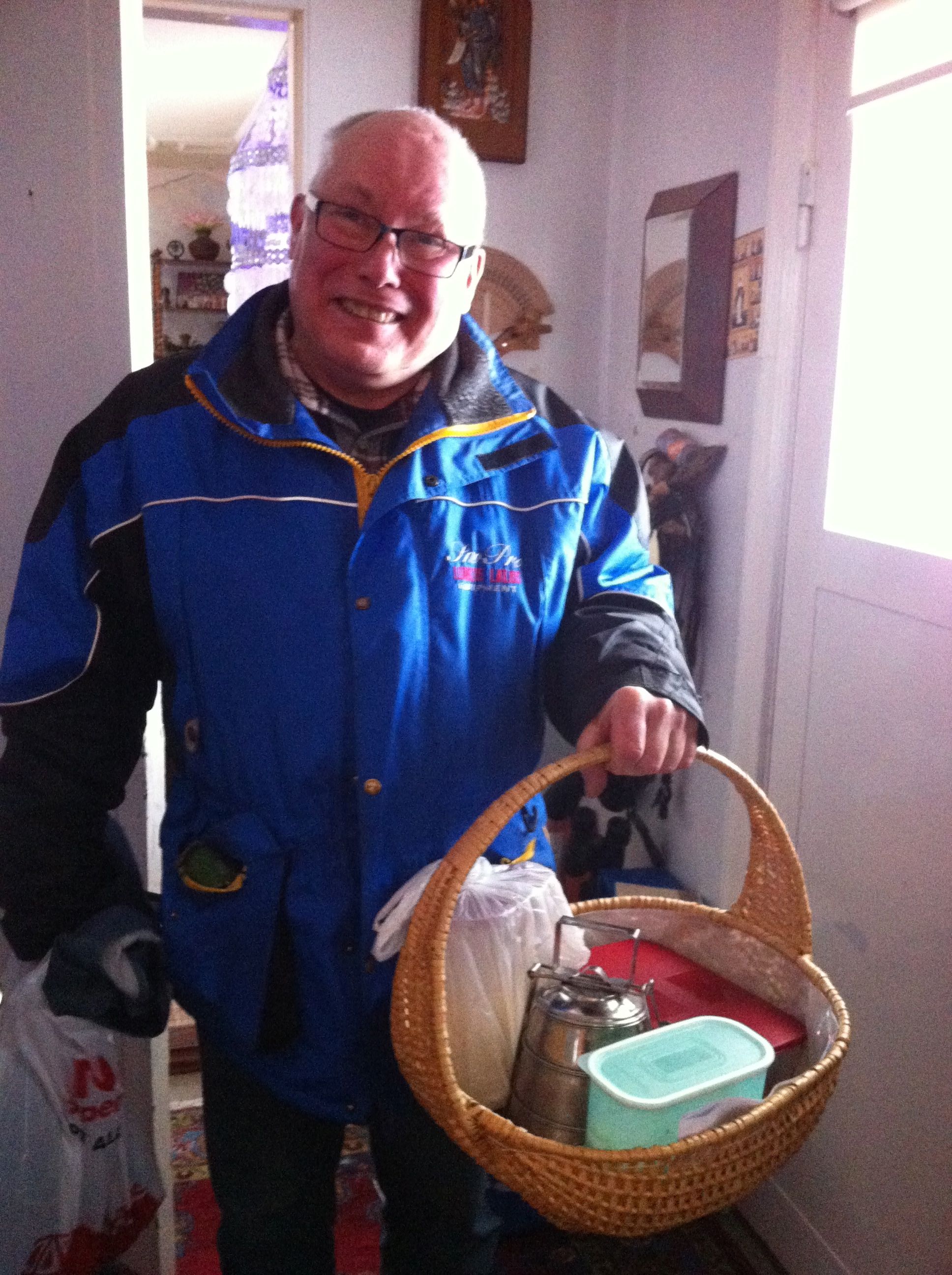 Stig har med sig en korg. med lite av vad de brukar ha hemma i sitt eget kylskåp. ”Tänkte det kunde vara kul att han får smaka sin egen mat, men på ett nytt sätt” säger Rurik.