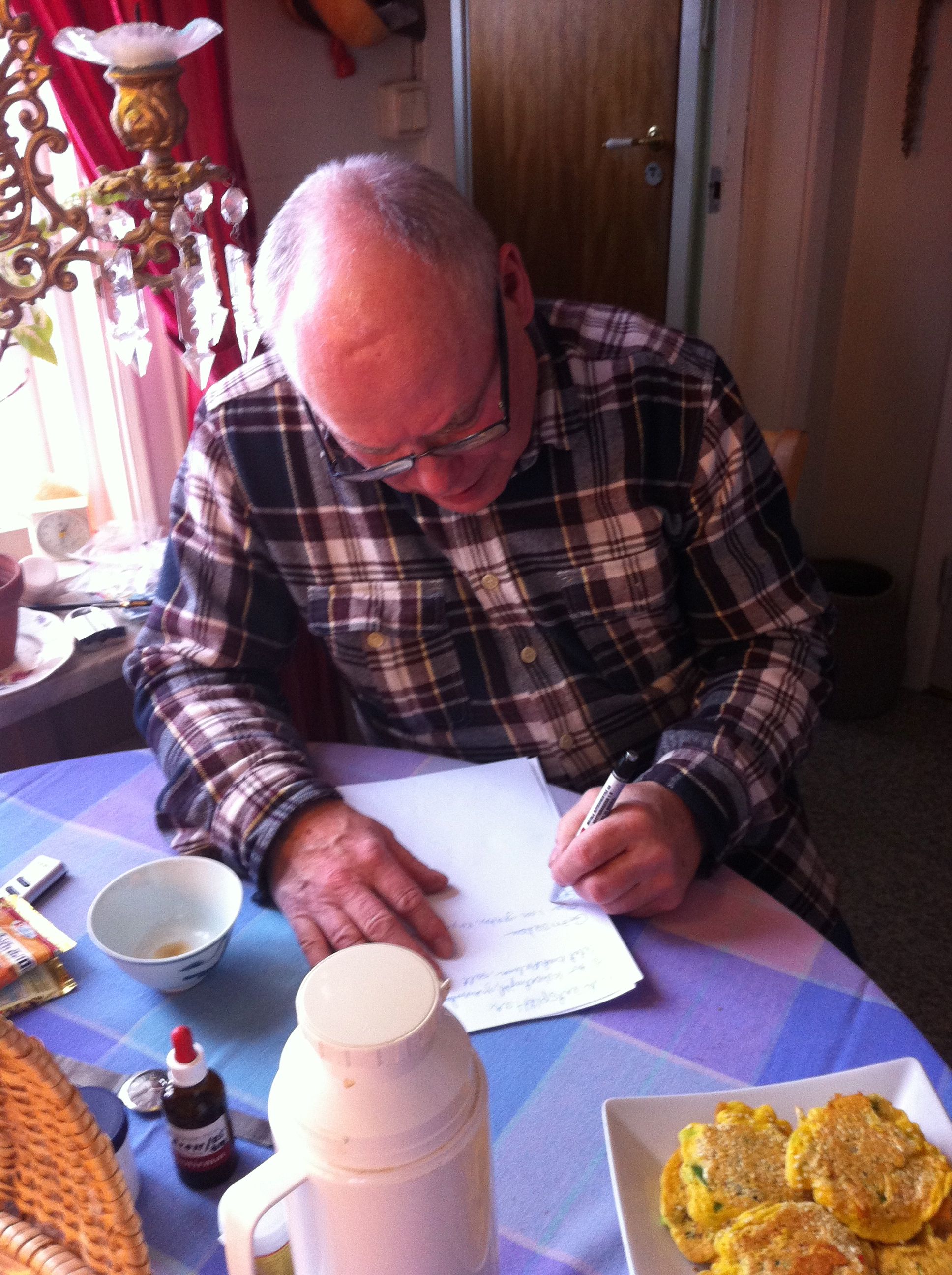 När jag kommer in i huset lutar det gott. Stig skriver så pennan och glöder… Stig är silversmed och medlem i Omkultur, precis som vi, Stig Blom. Men idag är han på djupt vatten. Skryter med att han kan koka ägg. Han är gift med Jane Sohlberg som också är med i Omkultur och är textilkonstnär. Det är nog hon som brukar stå för maten. Stig och Jane är nog vad man kallar allätare, men vegetariskt är både hälsosamt för kroppen och för moder jord. Men det är ett annat tänk när man lagar vegetariskt. hos en köttätare är det ju ofta köttet som är solen och så snurrar allt annat runt det. Nu är här inget kött… vad blir det då?