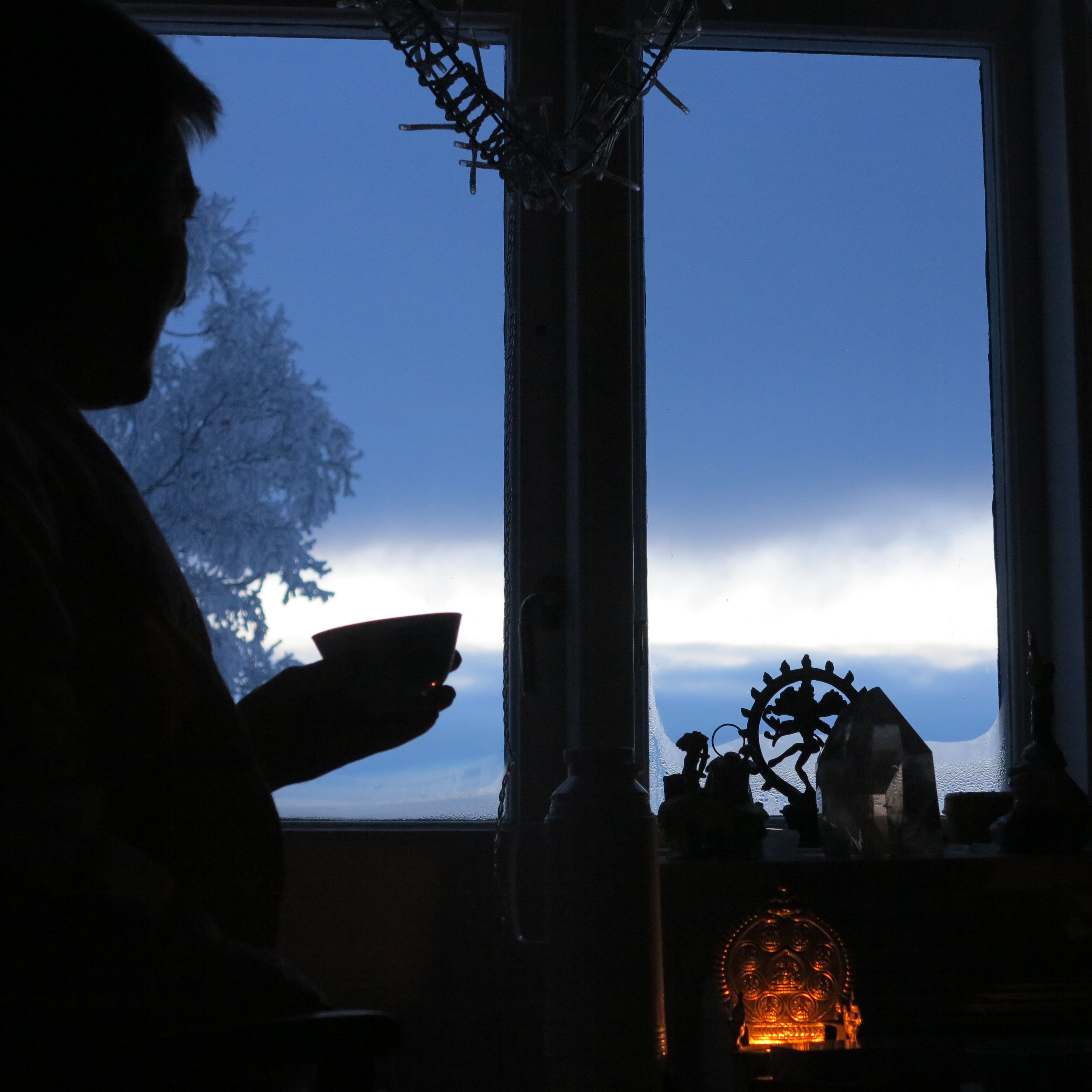 Åhhh. Det blir ljusare! Vi börjar dagen med vår kopp te. Tittar ut.