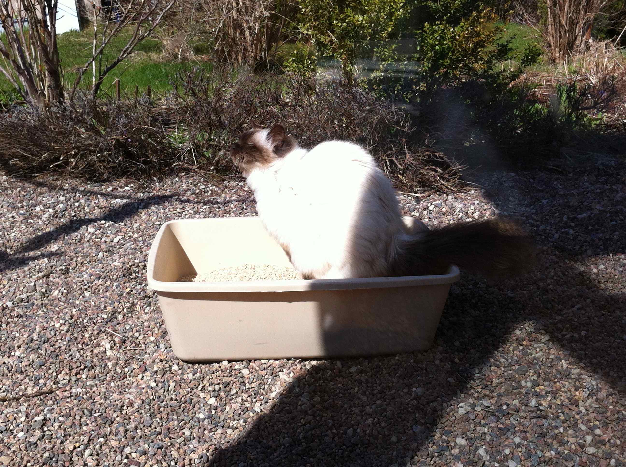 Så, vi städar, kattlådan åker ut. tycker faktiskt det ser ut som hon njuter väldigt mycket av att få sitta ute i solen och friskluften och göra stort i sin låda. Kan inte kattrackarn gå ut och sätta sig i rabatten?? Nä, fina damer bajsar inte i rabatten, så är det.