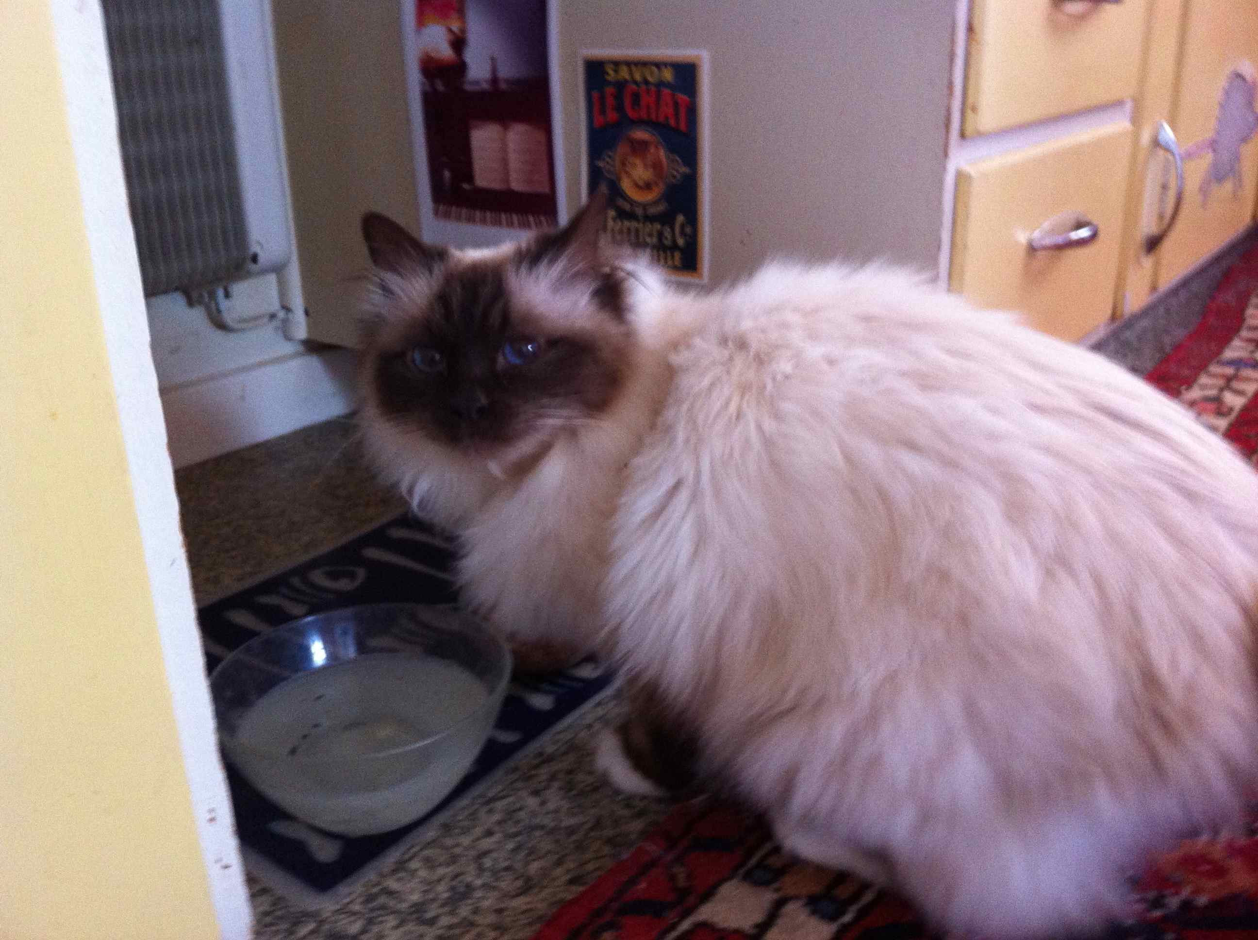 Eftersom hon ofta är dålig i magen, så fostrar vi inte henne för hårt, hon får ha sin sandlåda. Hon var ju innekatt hela sitt första år och sandlåda är liksom mest naturligt för damen. För vår del betyder det en massa extra arbete och utgifter, kattsanden yr åt alla håll när det krafsas – men vi har i alla fall koll på hur hennes mage är…