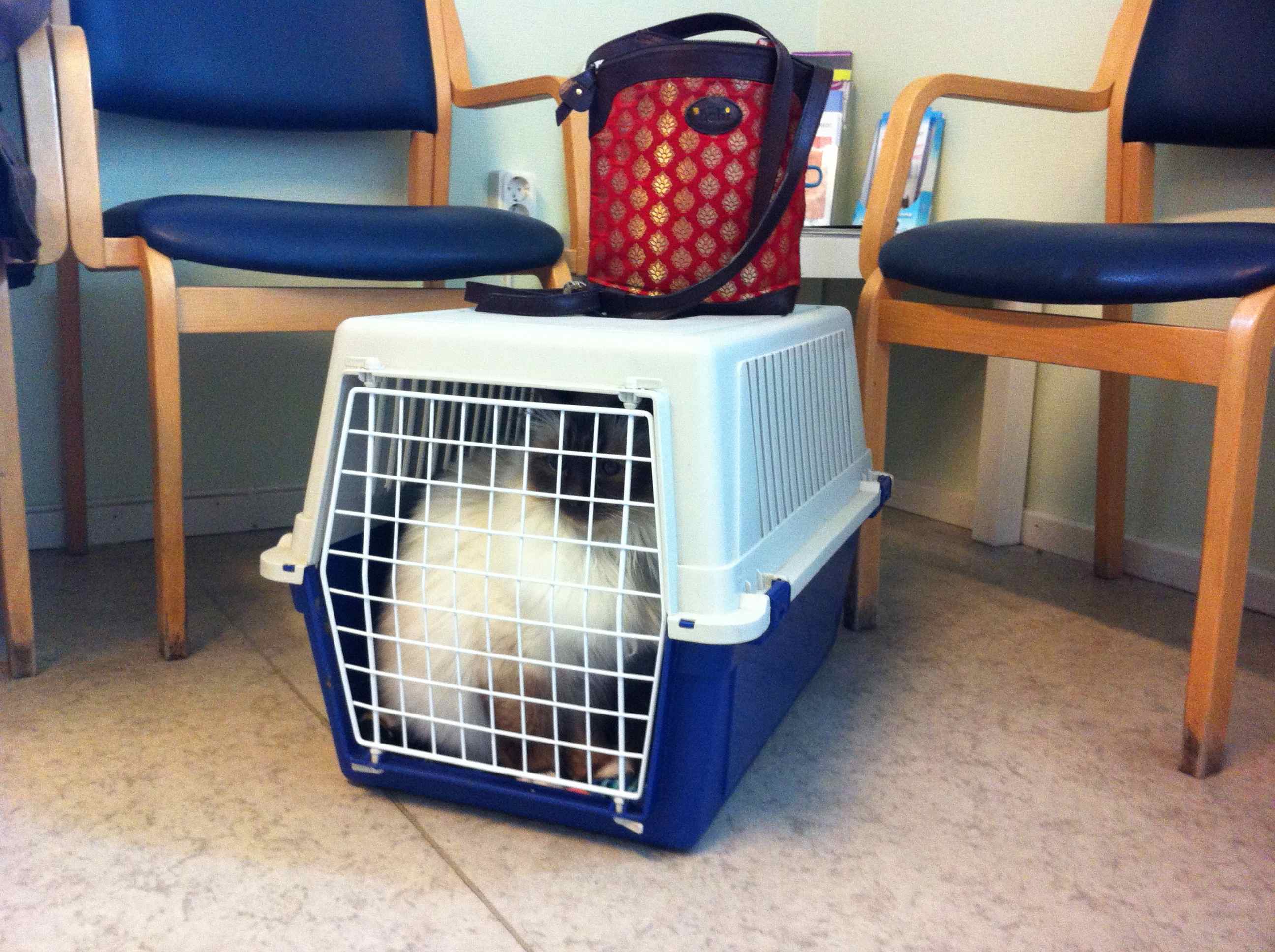 Magen är inte bra, så idag for vi till vår veterinär i Motala. Åka bil är otrevligt, så då bajsar vi lite av ren nervositet. Så där sitter vi i bilen, inlindade i ofräscha odörer! Men nu är vi framme och väntar på farbror veterinär.