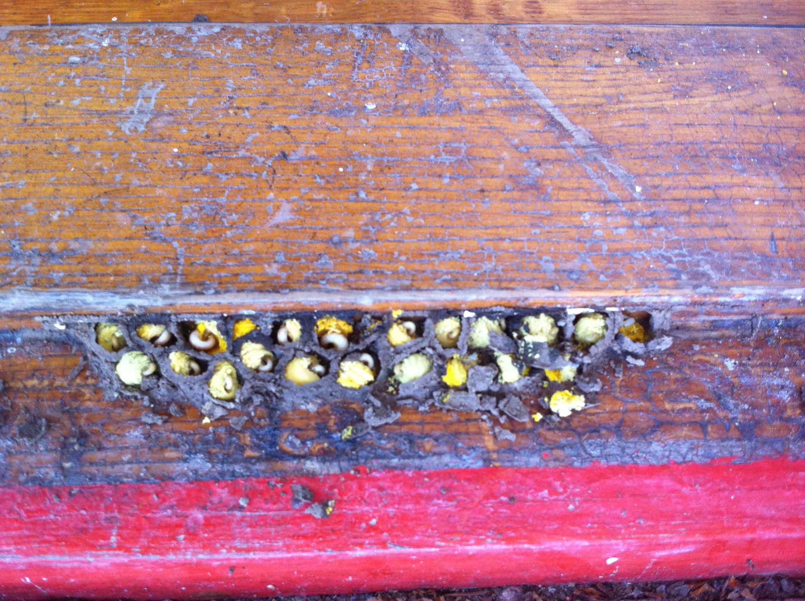 Kommer du ihåg Margareta? solitärbiet som valt att bygga sitt bo under vår ytterdörr? Vi har inte öppnat dörren på flera veckor bara för att hon ska få ha sitt bo i fred, Titta bara så fint hennes barn ligger där! Hoppas dom klarar sig trots att vi i dag…öppnade dörren. Kylskåpsleverans!