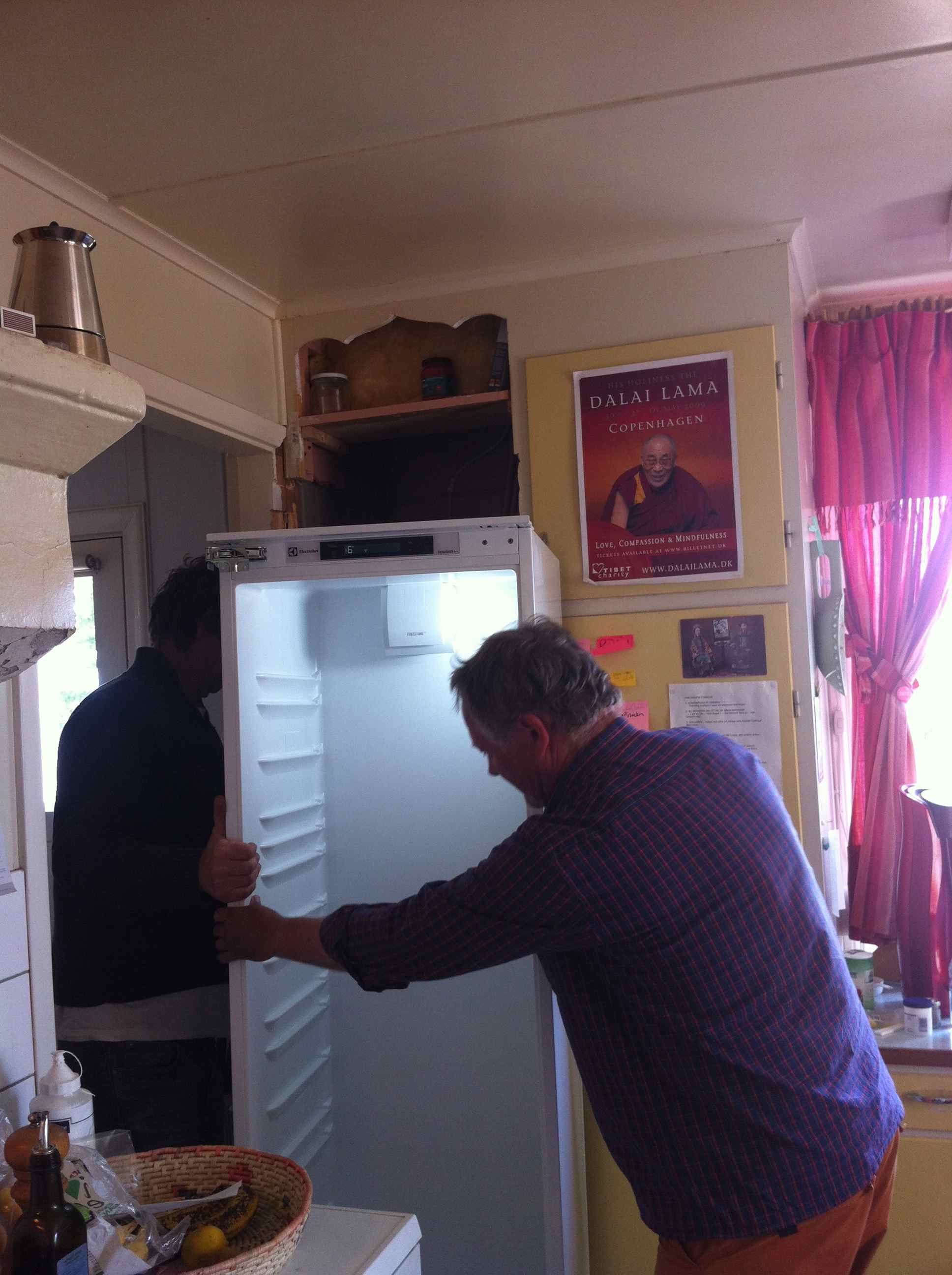 Nervöst satte vi i kontakten och kollade ljudet innan de satte det på plats. Men vilken skillnad!! 34 decibel, otroligt mycket tystare. Nu kämpar Rikard och Rurik in det nya kylskåpet. Det var ett millimeter jobb.