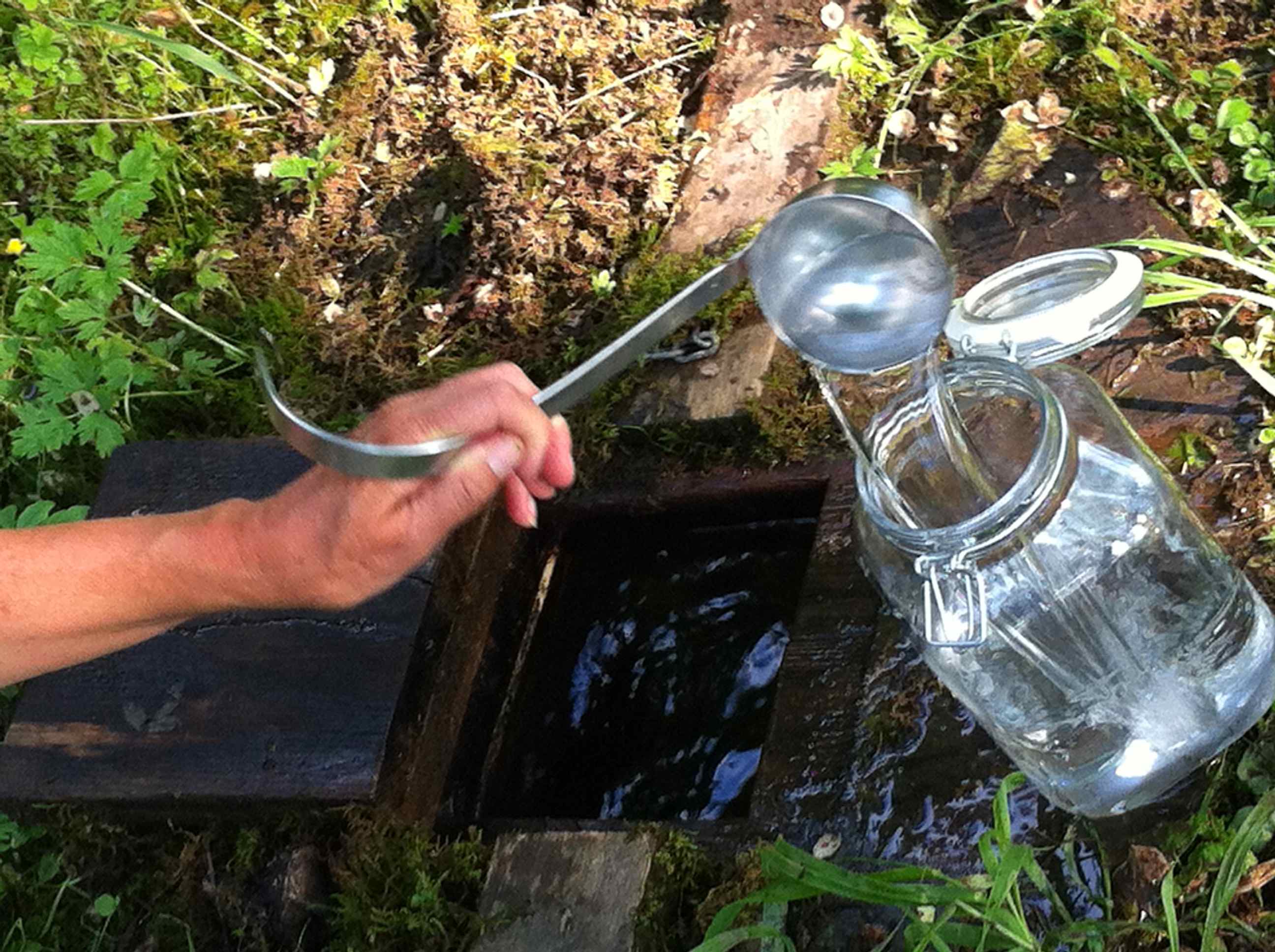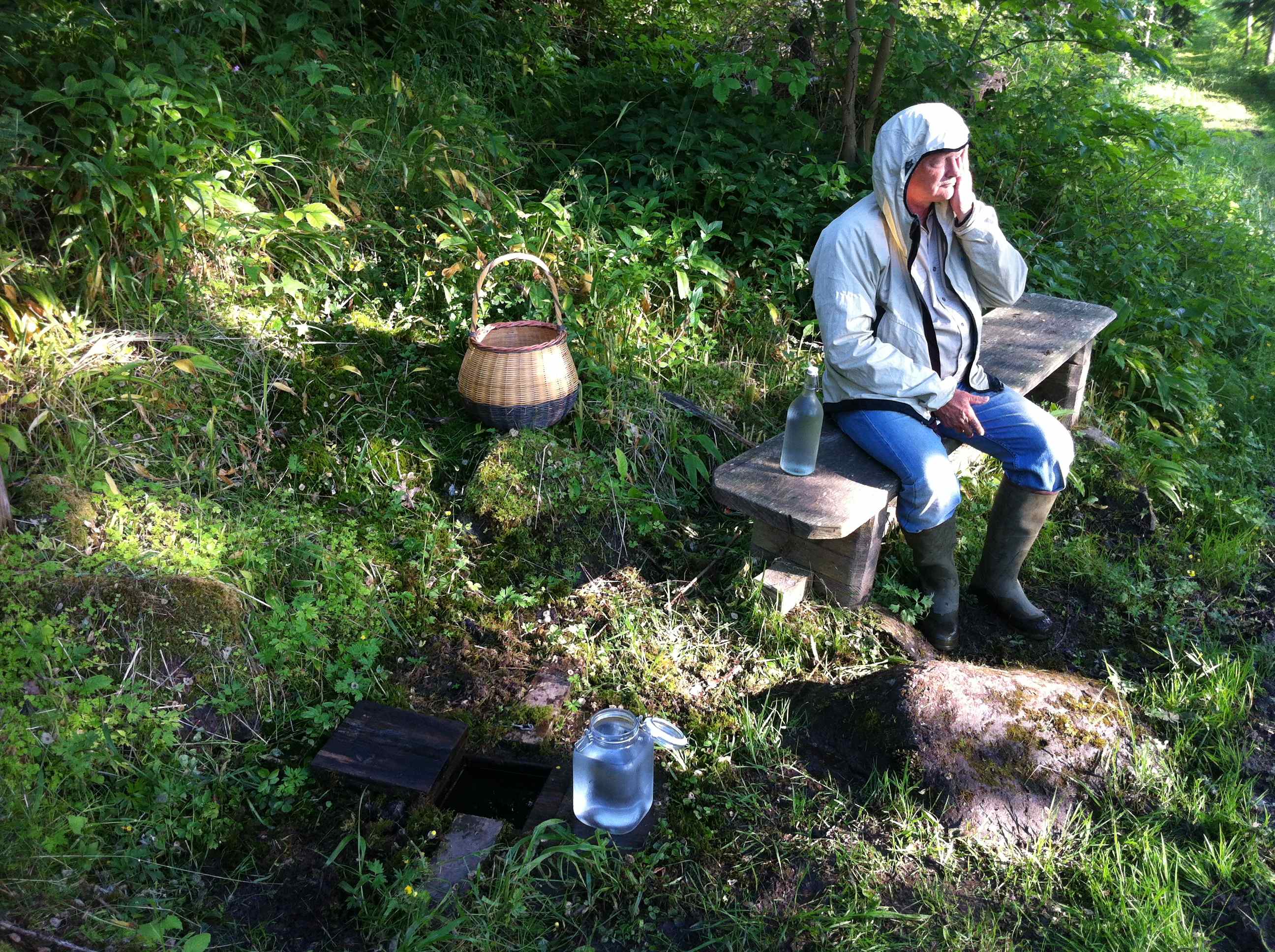 Vi ska göra egen medicin, en sorts energi-medicin, grunden till den är källvatten. Man säger att vatten som själv får leta sig upp till ytan i en källa har gjort en resa genom jorden på sådär 10 000 år gammal, det är ett urtidsmedvetande som vi nu häller på burk för att använda.