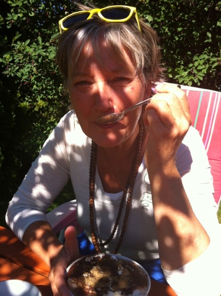 Det är Blåklintsbuss genom sommarSverige. I bagaget har jag nyfångad mandelpotatis och solvarma tomater från vårt växthus. Så är det när man bor på landet och ska besöka dottern i stan.