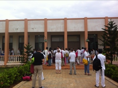 Undervisning varje morgon på engelska. Många har översättning o sitter med headset.