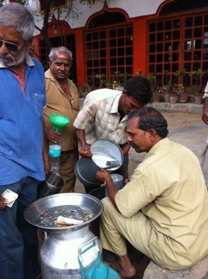 Kolla! Vad jag såg precis! Mjölkbudet. Även om struktur långsamt tar sig in i Indien också, så går många djur, både kor och grisar lösa här. Nu mot kvällningen är det mjölkningsdags, korna går hem, och mjölkmannen levererar.