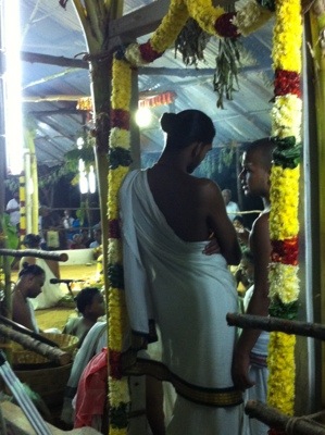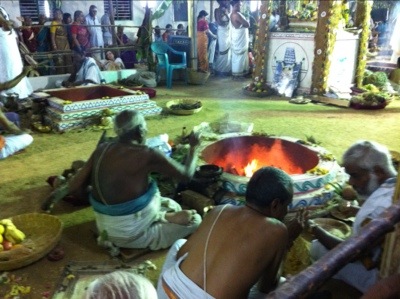 De var bara de riktigt gamla, kunniga brahminerna som satt vid den runda Homan. Homa är eldcermoni, och de pågick, avlöste varandra hela tiden. Kan tänka att de var dessa som var så kostsamma, det är bara det bästa man eldar upp, för att locka till sig de goda energierna. Massor med sanalwood har eldats upp.