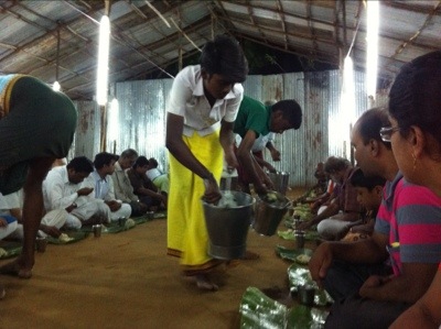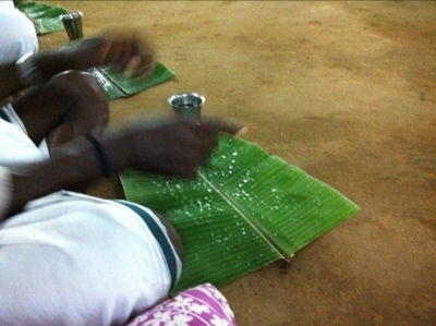 Där sitter vi i långa led, på marken. Maten serveras på bananblad. Vi börjar med att tvätta av det, för säkerhets skull.