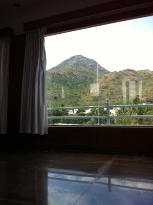 Sista morgonen i Thiru. Jag har tagit in på hotell. De har en yoga-meditationshall med utsikt över Arunachala, berget. Det känns sanslöst lyxit.
