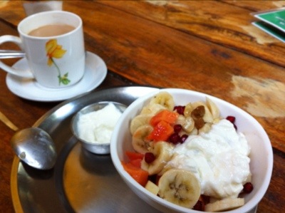 Här på Auro Ushas hotel, är stor mysfaktor och det är lätt att bli sittande hela dagen! Här finns fruktsallad och mat som man kan längta efter när man varit ett tag i Indien.