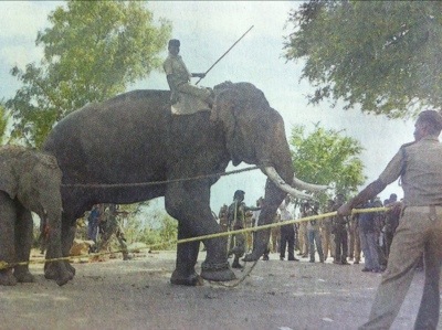 Tre arbetselefanter var med i arbetet med att få upp elefantgruppen på lastbilar. När jag ser på bilden tycker jag den infångade elefanten ser väldigt liten ut, det var nog ungdjur. Fyra av de sex elefanterna var hanar och det har beslutats att tre av dem nu ska dresseras till Kumki, arbetselefanter.