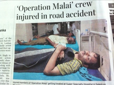 I hetsen med ”operation Malai”, som elefantinsamlingen kallades, blev det en bilolycka. Den lilla bussens ena hjul låste sig och bilen kolliderade med en lastbil. Nu kom de skadade hjältarna i tidningen.