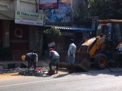 Längre ner på gatan gräver de.