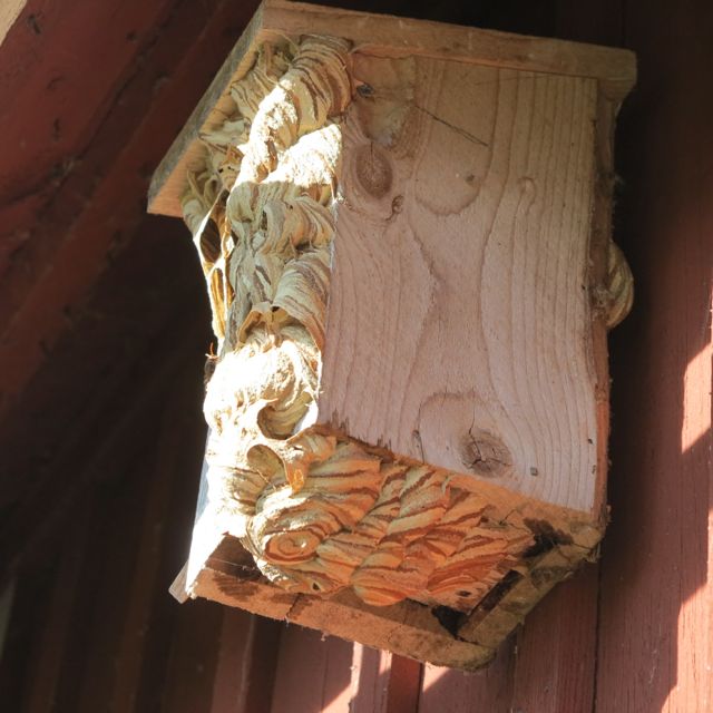 Nära ateljedörren… helt facinerad och nästan stel av fasa ser jag hur de grandiosa getingarna flyger fram och tillbaka. Vågar vi ha ett bo så nära dörren? Om inte, har man hjärta att ta dö på insekter vars överlevnad som art är i fara? Kanske kan man flytta på boet?