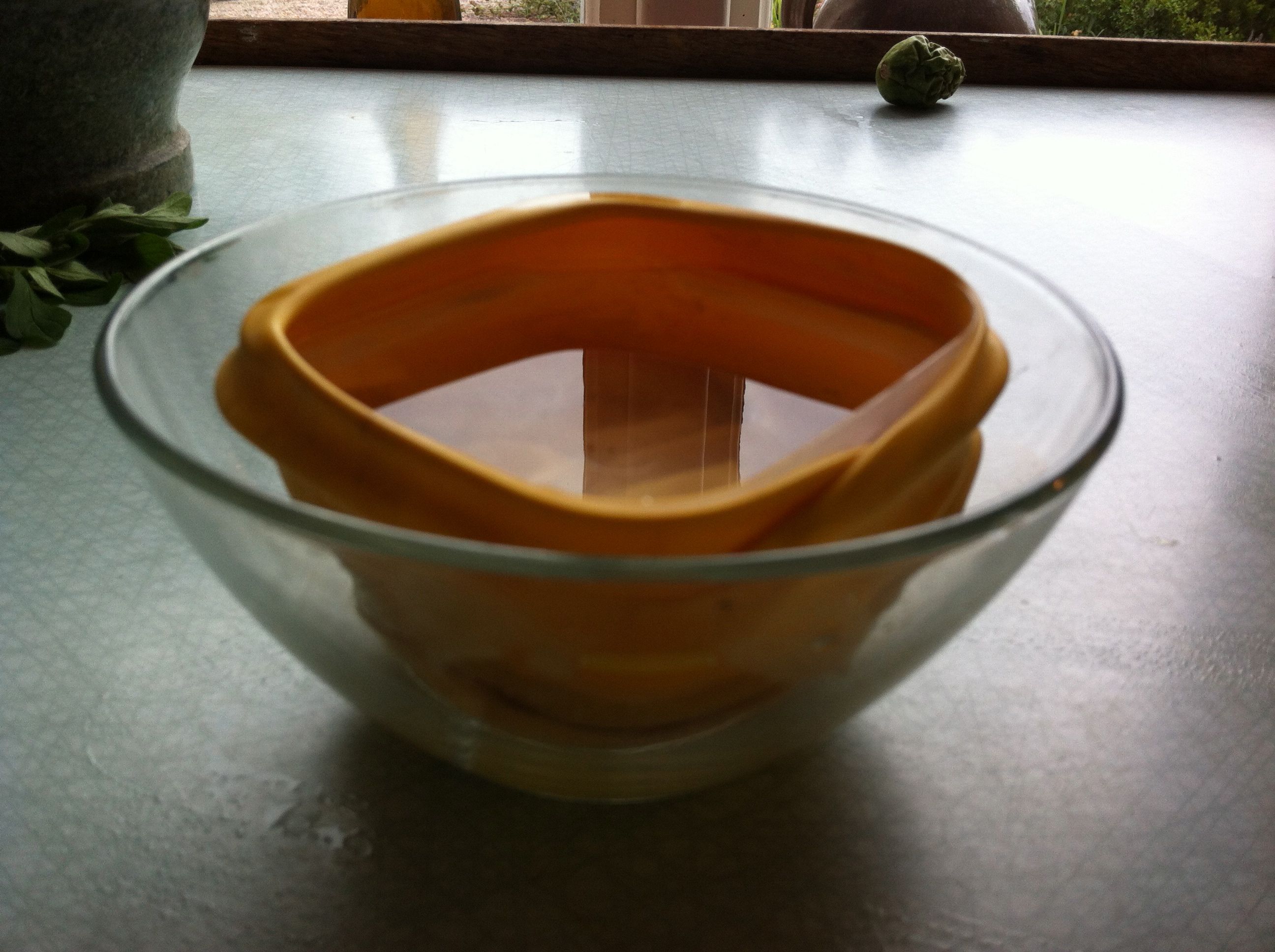 Idag blir det ett tips. En riktigt hemmagjord lösning på de jobbiga bananflugorna. Det är en gummihandske jag har trätt på den lilla burken, då blev den så vinglig så den fick stå i ännu en skål.