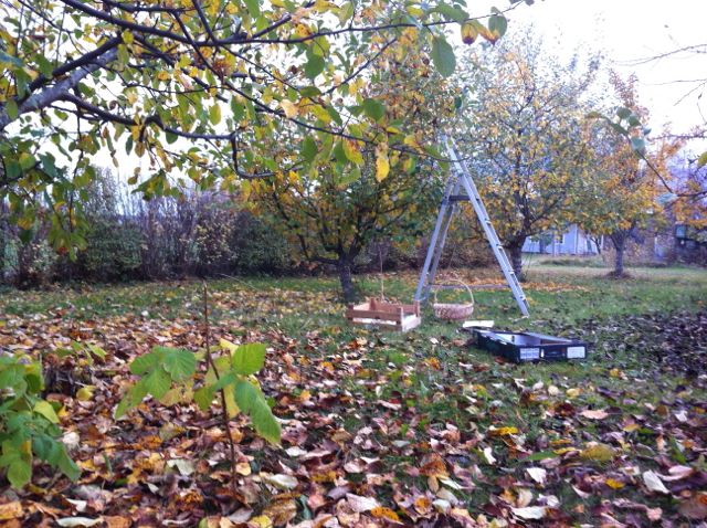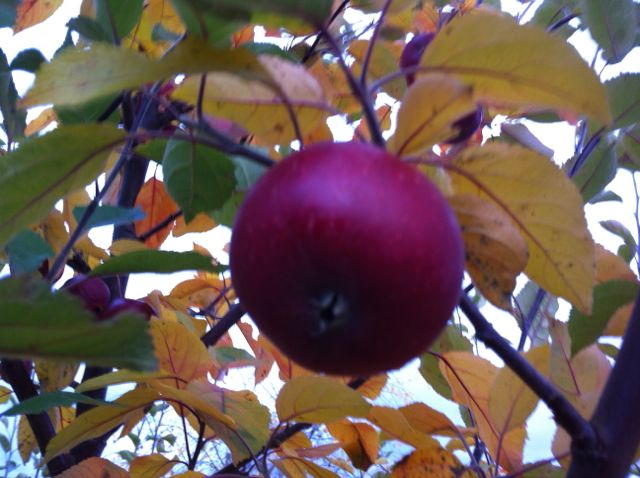 Ett gult äpple är avslöjat nu när de gula löven har ramlat. Kamuflagen är borta. Den får hänga kvar….lite får man ju bjuda fåglarna på, eller hur?