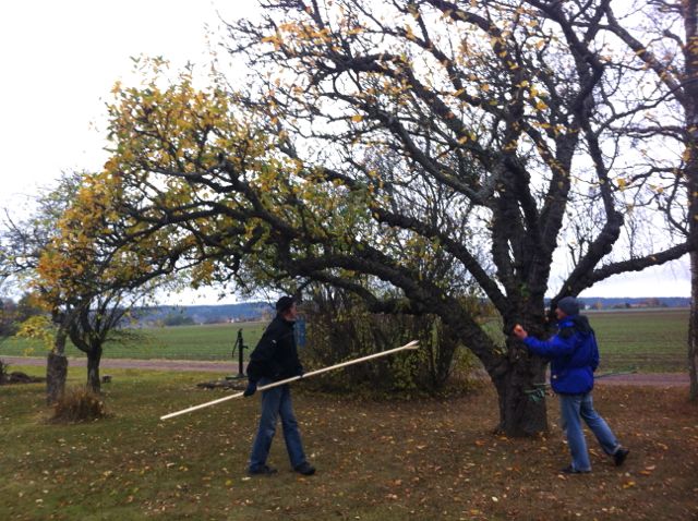 Åkerö-trädet är 90år gammalt, minst. Egentligen är redan träden färdigplockat, men inte ska vi väl gå förbi utan några äpplen! Trädet fäller de sista löven för det här året och några förskrämda, kvarglömda äpplen sticker fram.