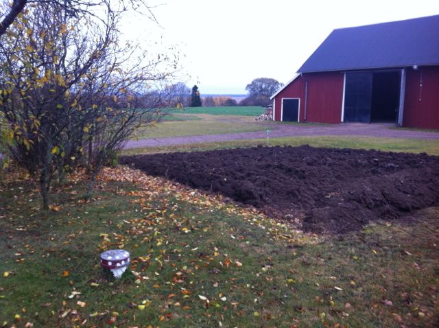 Vi är ute o går. stannar till hos grannen. Han har en liten potatisåker. en väldigt liten, liten ruta. Den är mindre än vad den ser ut på bilden! Hur har han lyckats plöja den? Vända med traktorn o allt det där?? rutan är perfekt och vi fattar ingenting.