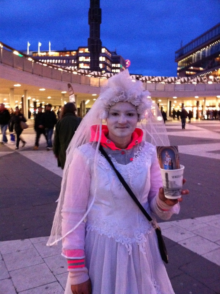 Årets mest inspirerande tiggare finner vi på Sergels Torg. Jag blir helt tagen när denna vita varelse svävar fram till mig både änglalik o spöklik, rabblande om Ave Maria. Utan tvekan och med ett leende lägger jag en peng. Så fint, hon hade förvandlat tiggeriet till en vacker föreställning!