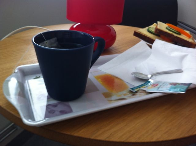 Jag dricker te och får kissa i en ”Texashatt”. Det mäts noggrant. ”Ohh vad dukig du är” , utbrister sköterskan när hon kommer och kontrollerar. Jag skrattar och  känner mig duktig som den bästa tvååring .
