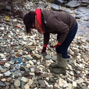 På en liten bit strand, bakom stenhuggeriet ligger det bitar av marmor, slipade an vattnet.