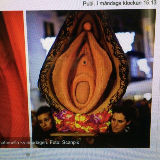 Tycker bilden av kvinnoskötet, med blomgirlanger runt foten, som bärs omkring ungefär på samma sätt som en gudabild eller ett helgon, är så härlig! Helt klart behövde vi en sexrevolution en gång i tiden. Porrindustrin förvandlade könet till något annat, till något som kan exploateras, tjäna pengar på och som åter igen har skapat, nya, knepiga föreställningar om sexualitet och kvinnlighet.