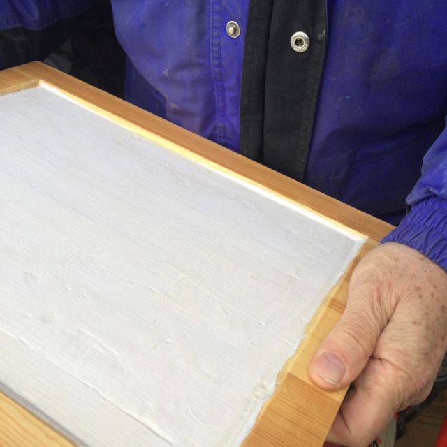 Det är många lager av grundering som ska på, men ett pill-moment är över, när duken är fastlimmad i botten. Plattan blir helvit när den är klar. Sen är det bara att måla!!