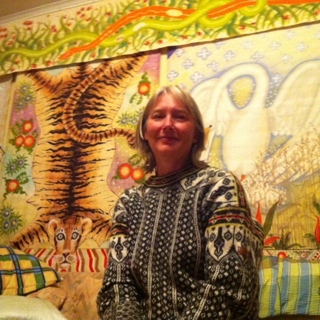 Vardagsbild. Brokigt och vilt. Känner mig närmast mönster – kammoflerad i allt överflöd! Jag i min stickade, välmönstrade tröja i ett överdekorerat rum! Ja, så blir det gärna när man är konstnär. Det blir mycket på väggarna. Här, i det här huset bor vi två. Ja, det gäller att inte vara bildrädd.
