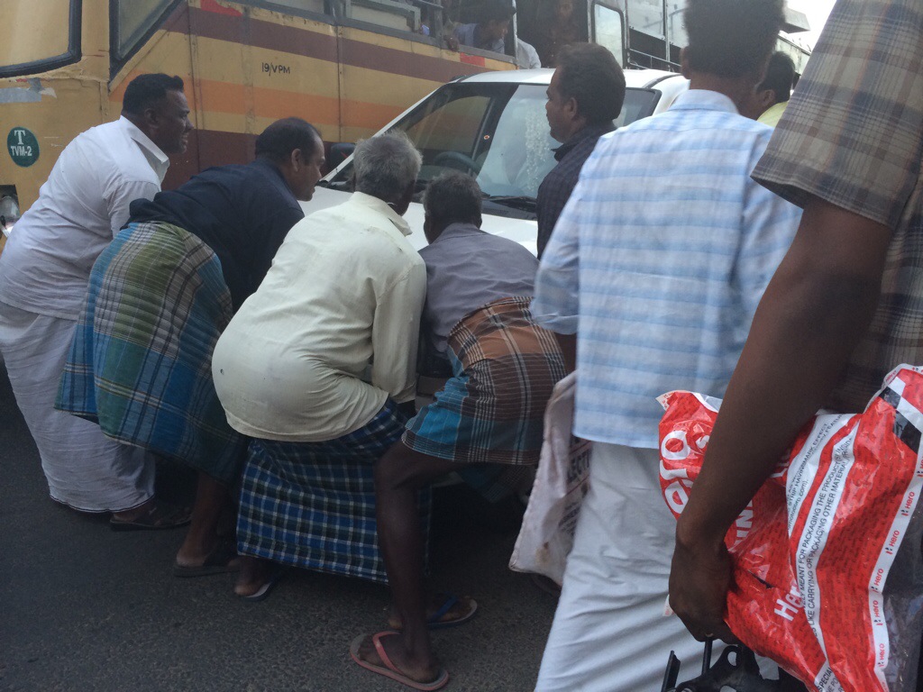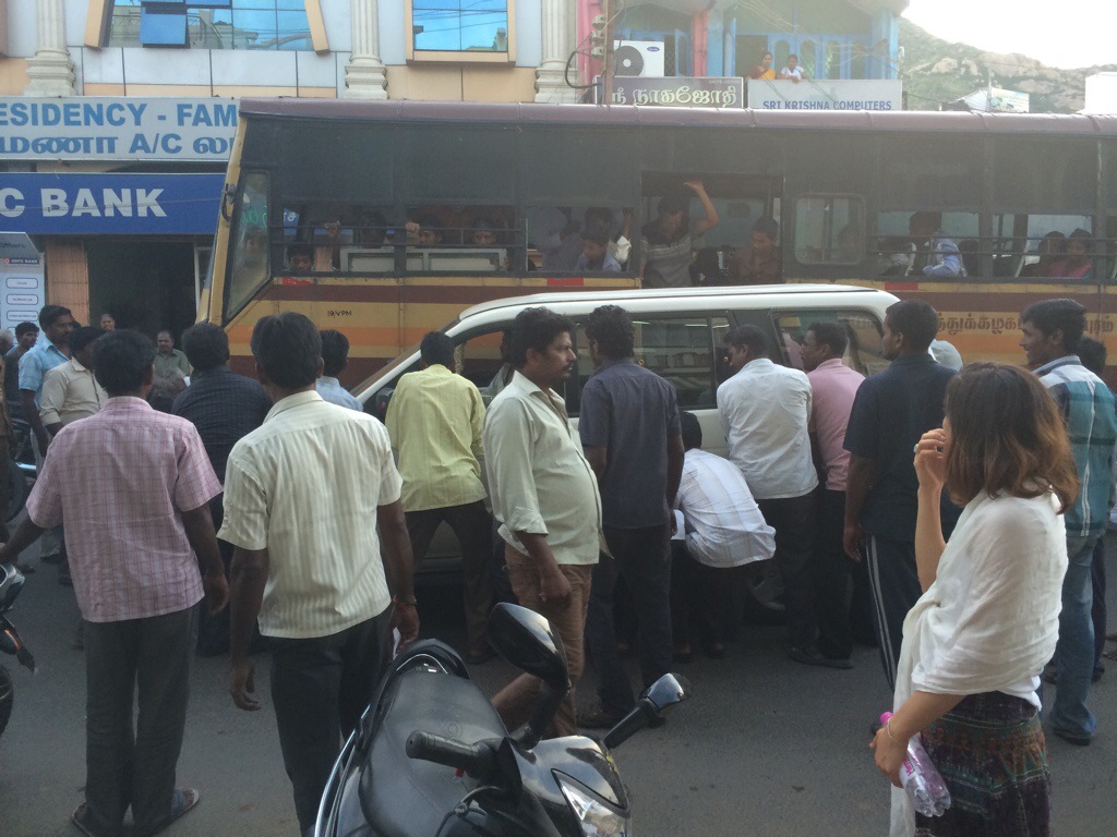 Shiva har sitt eget sätt att välkomna. Allt sker i slowmotion: en buss glid upp och pressar sig långsamt in i sidan på vår taxi. Ingen skadad men bilen fastnar i bussen. Hela gatan engagerar sig i händelsen.