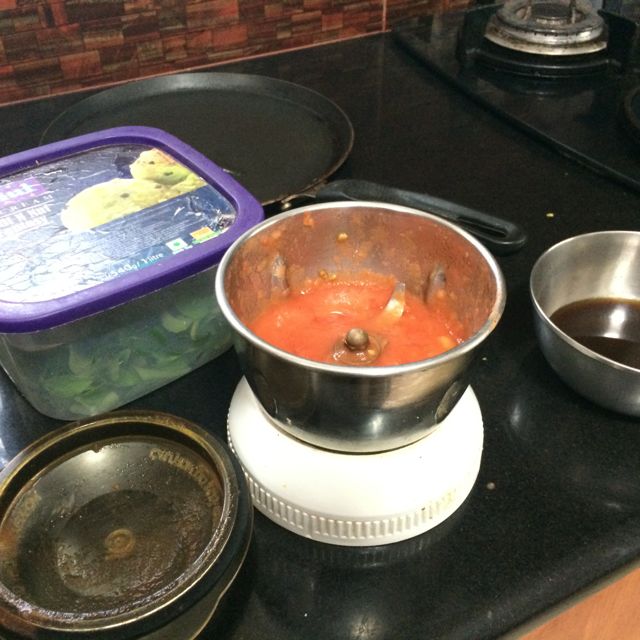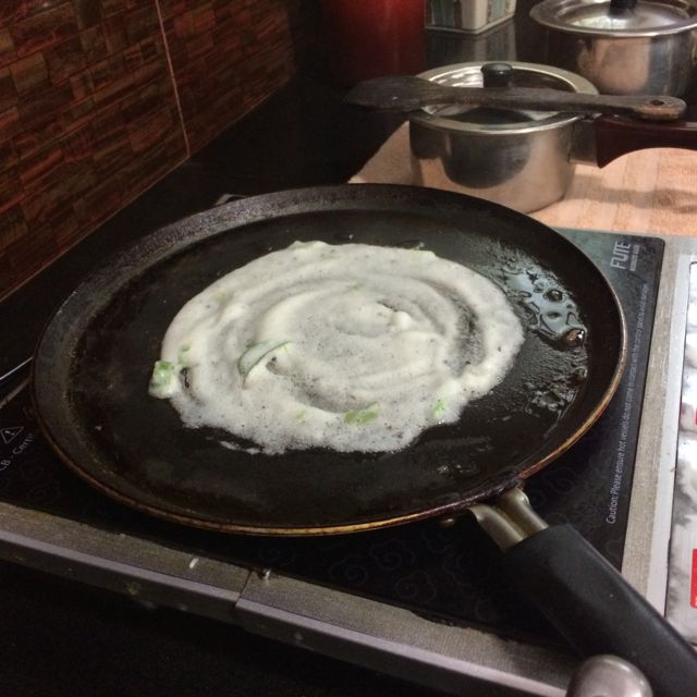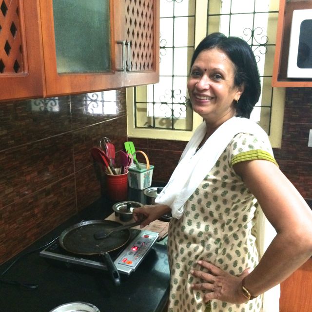 En liten dosa fräser nu på plattjärnet. Använder  en induktionshäll som hon älskar.  Annars är det mest gasspis som gäller i Indien, och det har hon också. Dosas är gjorda på malt ris som får fermentera så de blir en syrlig smet, de steks långsamt och blir till frasiga delikatesser som är typiska för södra Indien.