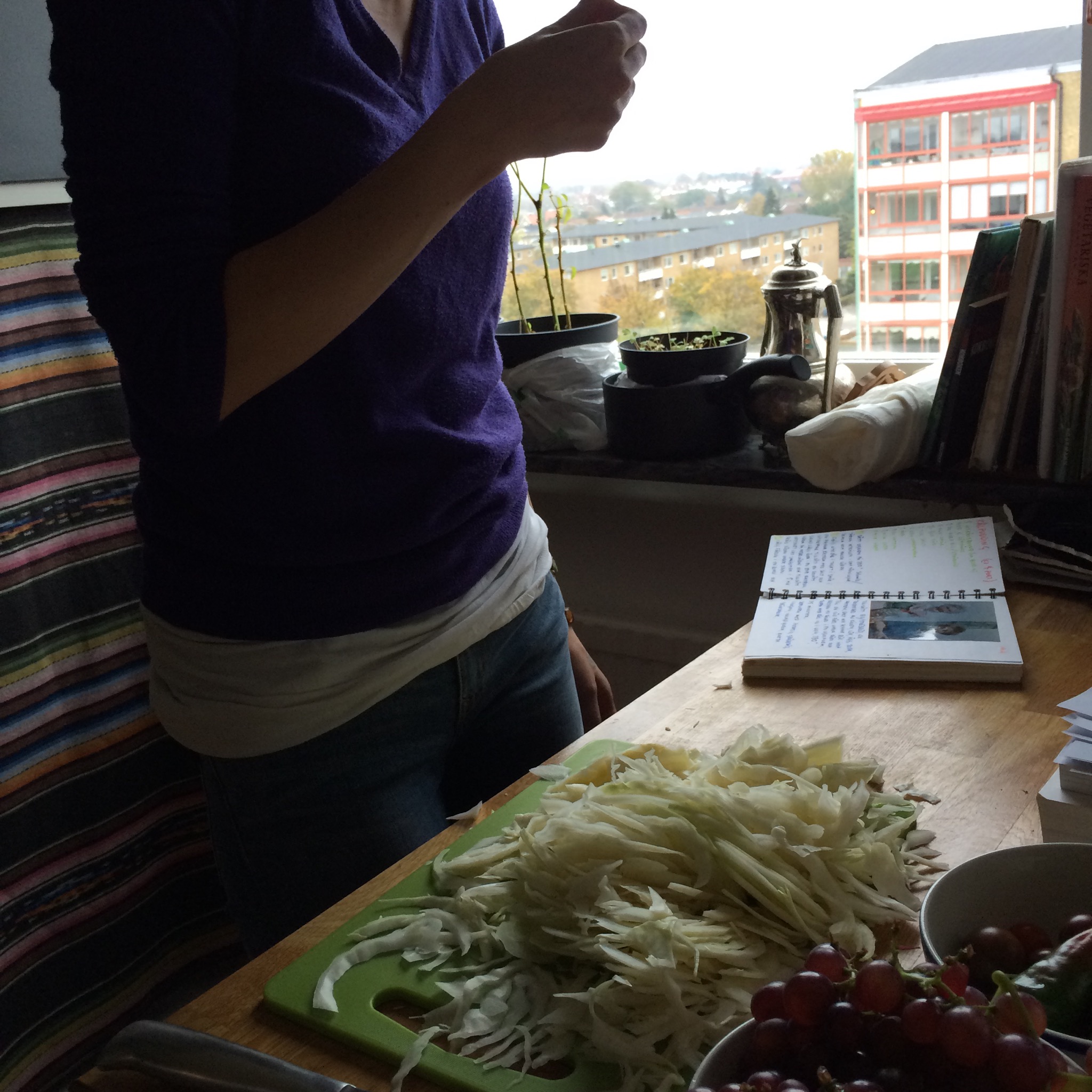 Nu hackad det kål. Bredvid ligger receptboken. ”Men, vad är det för bild??” Bilden ser så bekant ut.