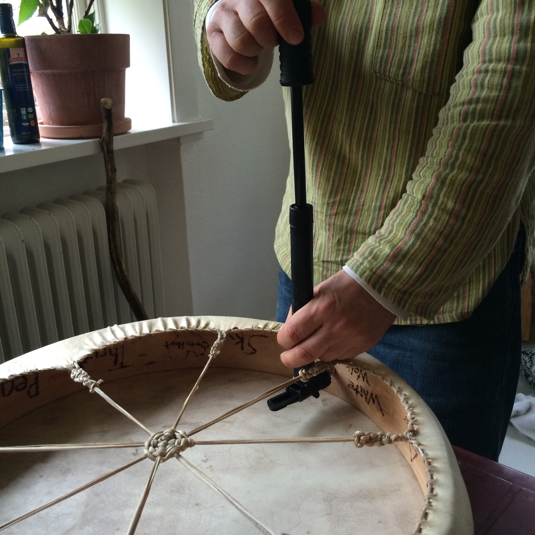 Nu spänner Martin ut skinnet med den inbyggda cykelslangen och trummans ljud blir spänstigare.