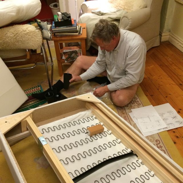 Det tog 20 minuter. Att öppna paketet och att få ihop soffan. Då var vi ändå långsamma, tog det lugnt.