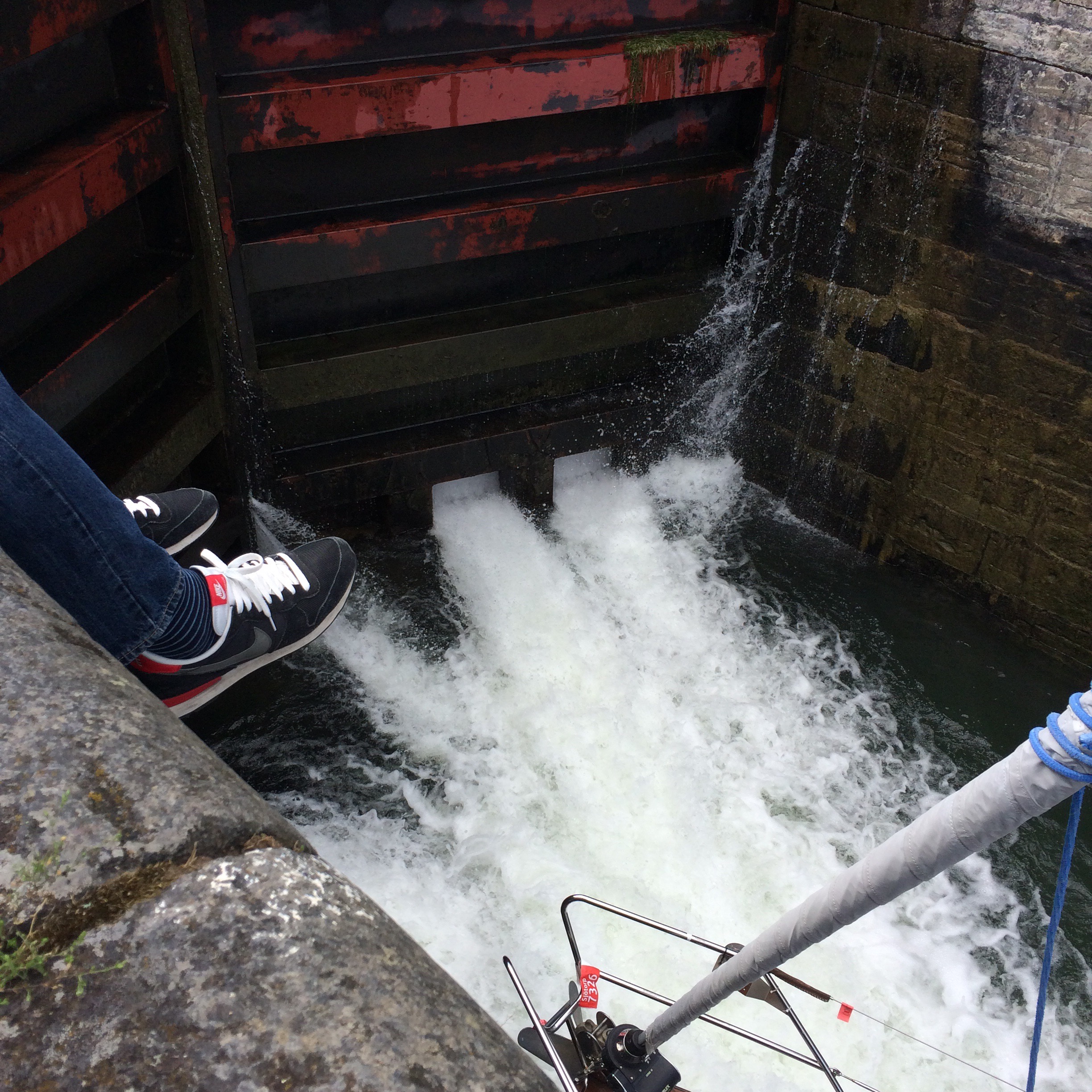 Båtarna höjs sakta upp. Mäktigt med det forsande vattnet. Och vi följer processen med odelad uppmärksamhet.