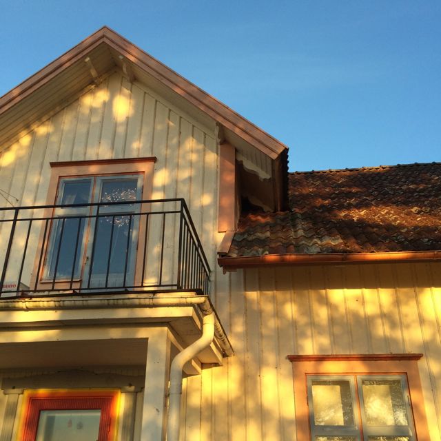 Höst, men fortfarande skönt varmt. Barfota. Stilla morgon, huset ser nyvaket ut.