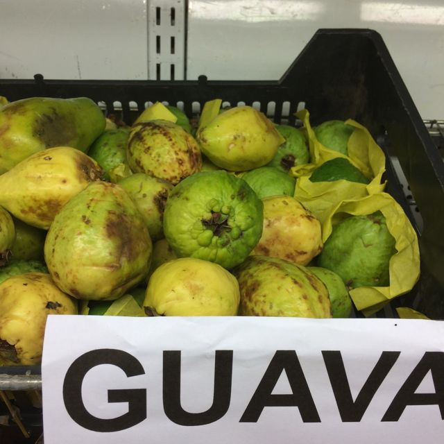 titta här, Maria. guava!!! Rurik köpte inga i Helsingborg för vi har ju så mycket frukt hemma…… men mogen GUAVA!!! Det kan man ju inte vara utan. När man stoppar näsan nära en mogen guava fylls man med en doft så att man genast är förflyttad till Indien. Hela Indien luktar sådär! Den är svårlagrad och ser väldans oansenlig ut, denna frukt. Men skattas som medicin och äts högtidligt till maten av Indier.