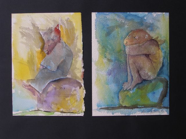 Det här är näst sista inlägget(tror jag) på tema Gangas bilder. Nu blir det akvareller, storlek mindre. Alla glasade och ramade. Fast den första är kanske inte så lite,40 x50cm. ”Funderingar på en sten” Akvarell 3 800kr