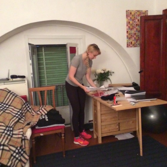 Jag är kurir. Har stora väskan med vinterplagg till Rita. Fast här står jag o svettas. Känns ju lite konstigt att prata om vinter ….