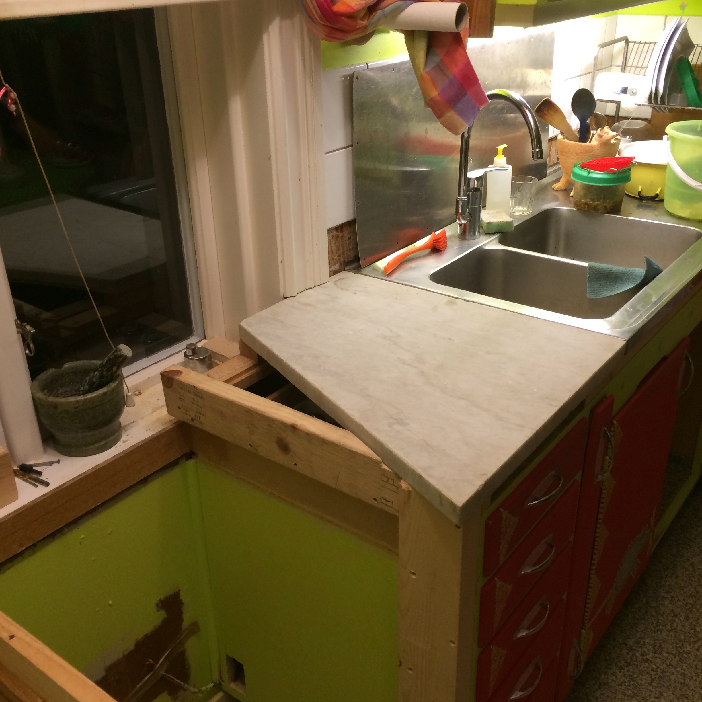 Utan att riktigt ha kommit till beslut satte Rurik igång med projekt höja köksbänken. Pilljobb. Sen hittade vi den där vita marmorskivan som bara stått där ute i några år.
