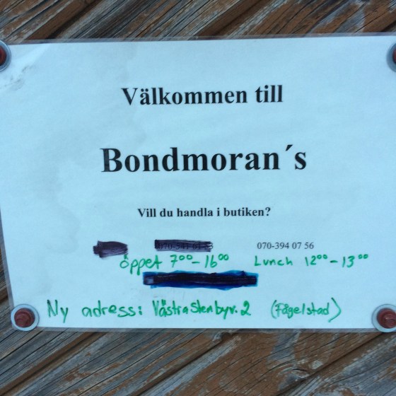 Vi stannar till för att handla champinjoner. Det är nu man förstår att man bor på landet. ”Bondmorans Champinjoner” visst e det gulligt. Vi är nöjda lantisar och gynnar gärna andra lantisar.