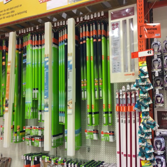 Nu blir det produktinformation. För det här vi letat oss blåa efter! Nytt lysrör till armaturen för ljus till våra små växter.”Nä det har vi inte, man måste köpa hem så många, om man ska ta hem, så det går inte.” Så får vi gå vidare.