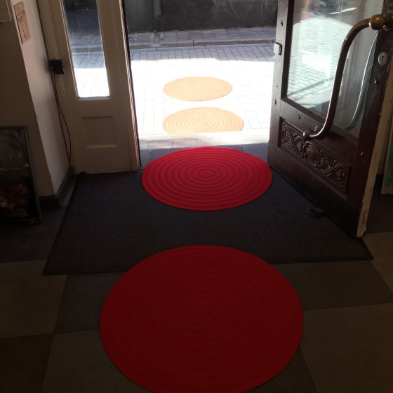 Anlände till huvudstaden med en bunte IKEA prick-mattor under armen. Vitsigt att locka in folk med röda prickar till ett galleri…. Tyckte vi…. Tills en mycket bestämd glass-säljardam kom in o undrade om vi hade tillstånd och om vi hade tänkt ”på de stackars blinda”