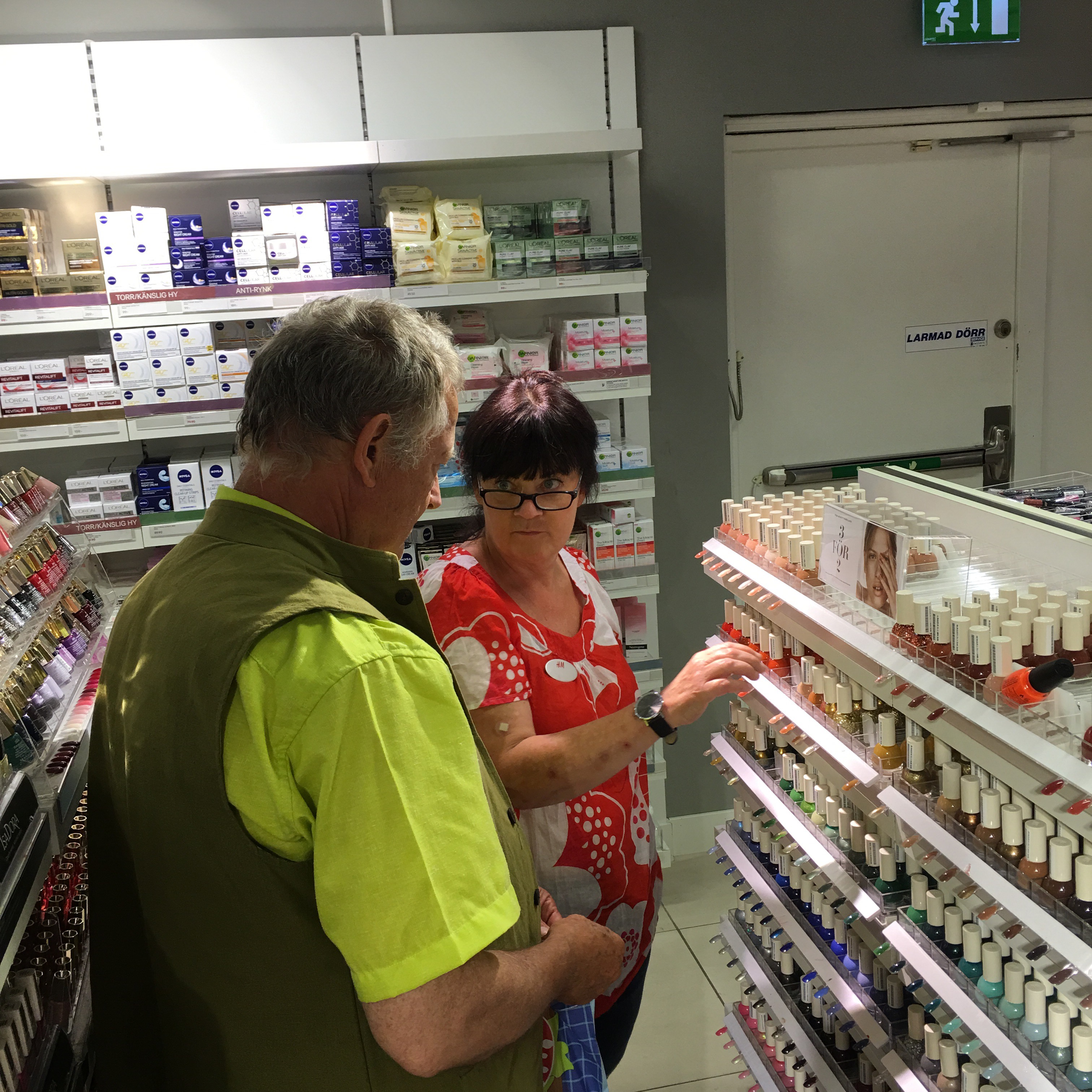 Köp tre och betala för två. Dom har blivit en sån succé, sitter så bra. Expediten pratar på och Rurik snosar runt bland guldlack och neontoner. Det var lyckan.