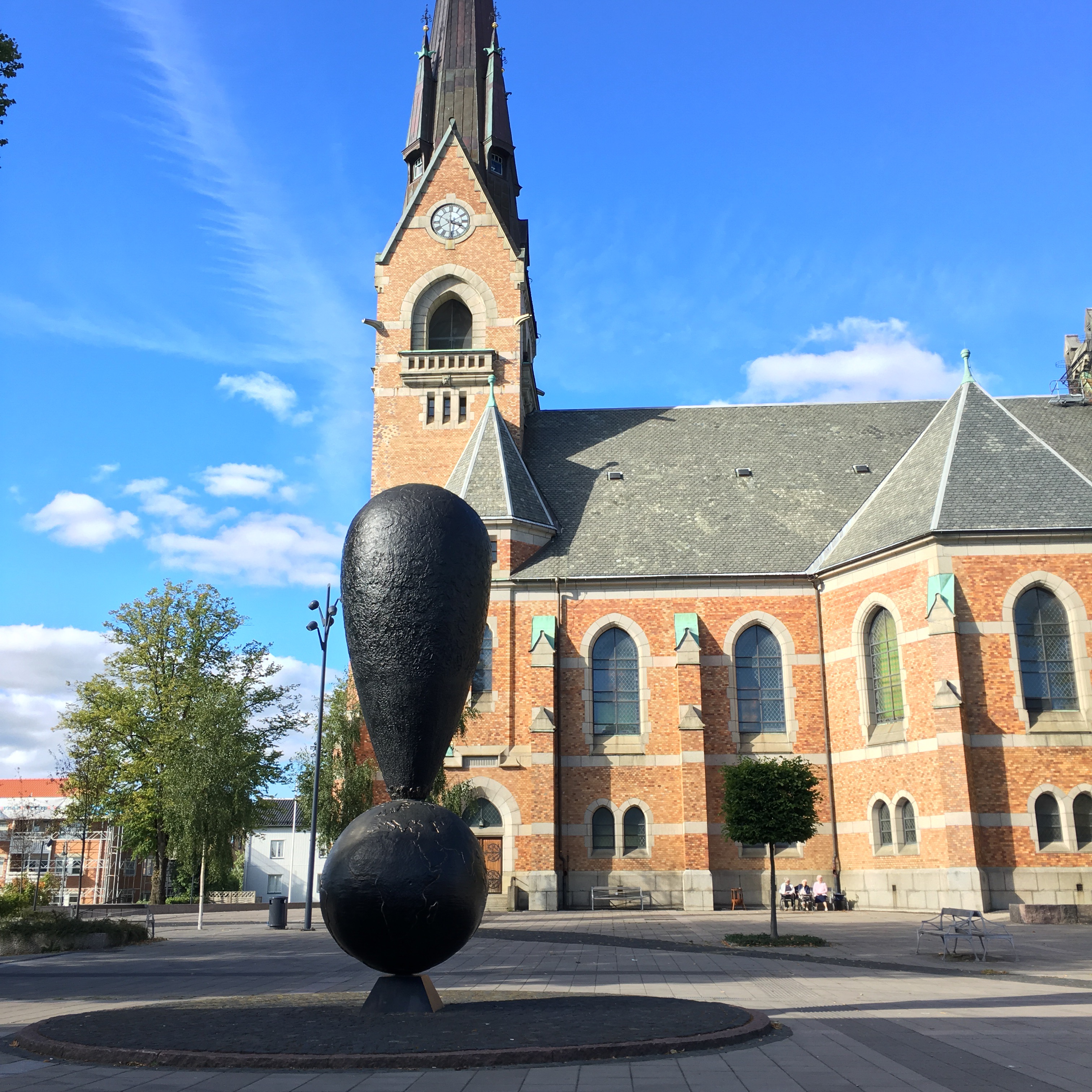 En jordglob ropar som ett utropstecken utanför kyrkan.