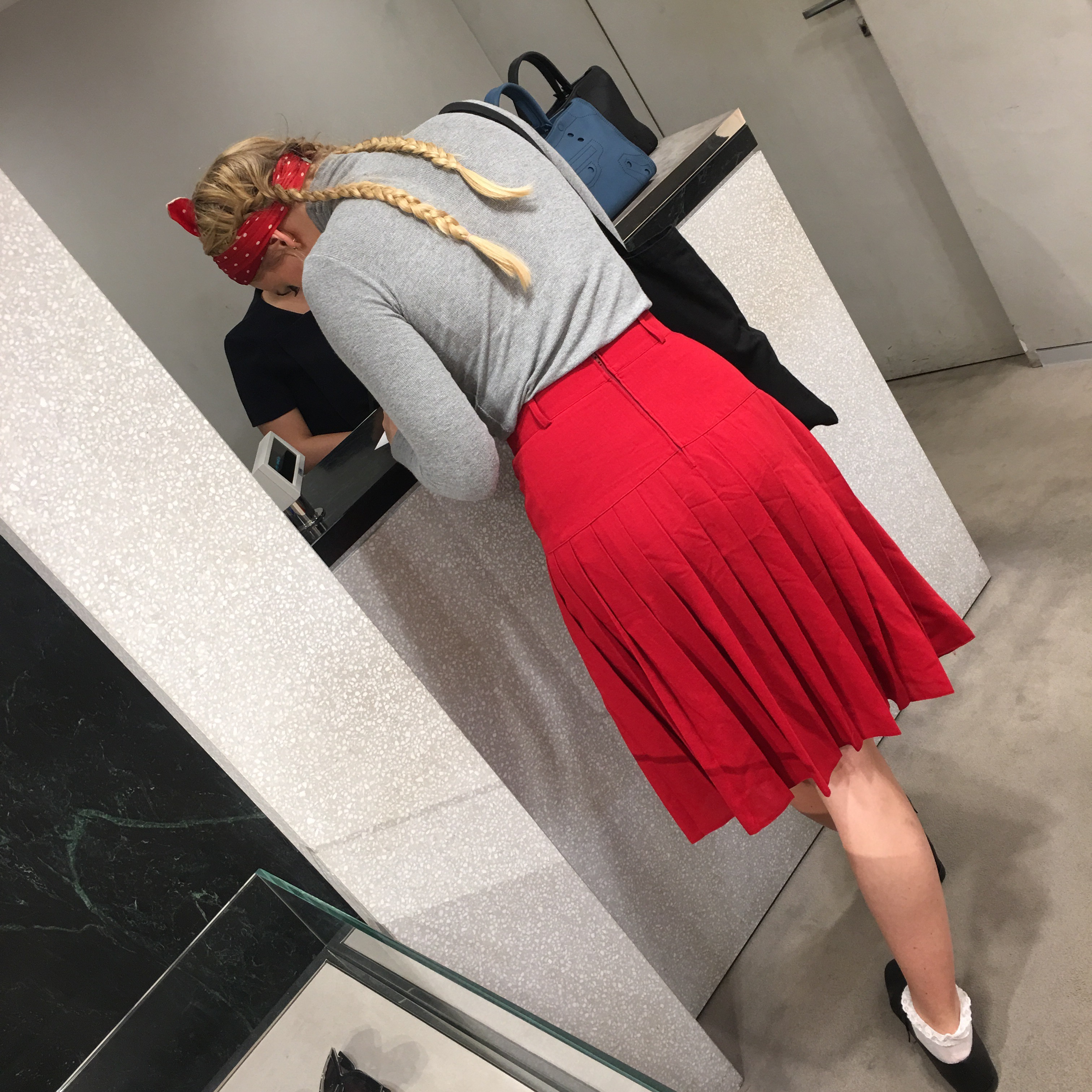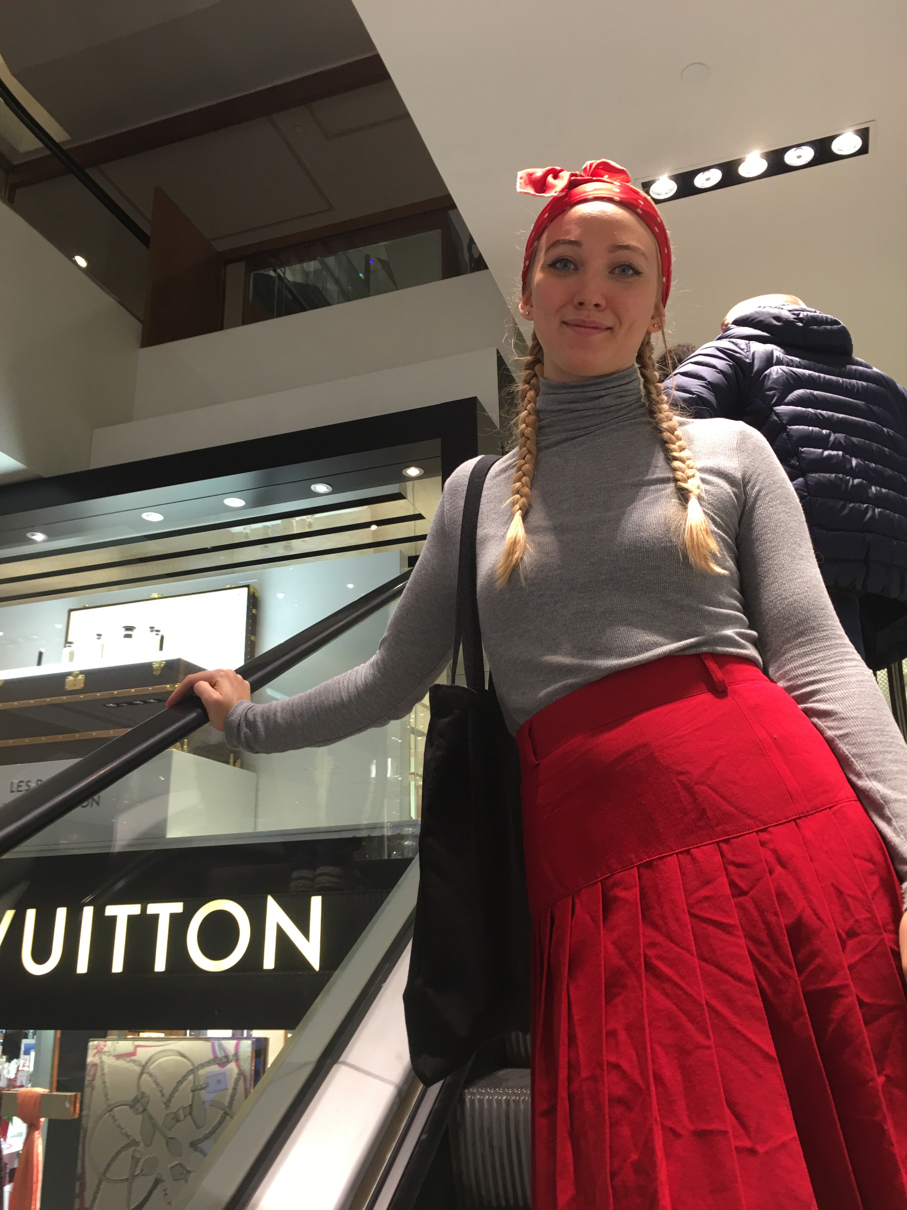 Jag smyger med. Hon granskar finskor o väskor