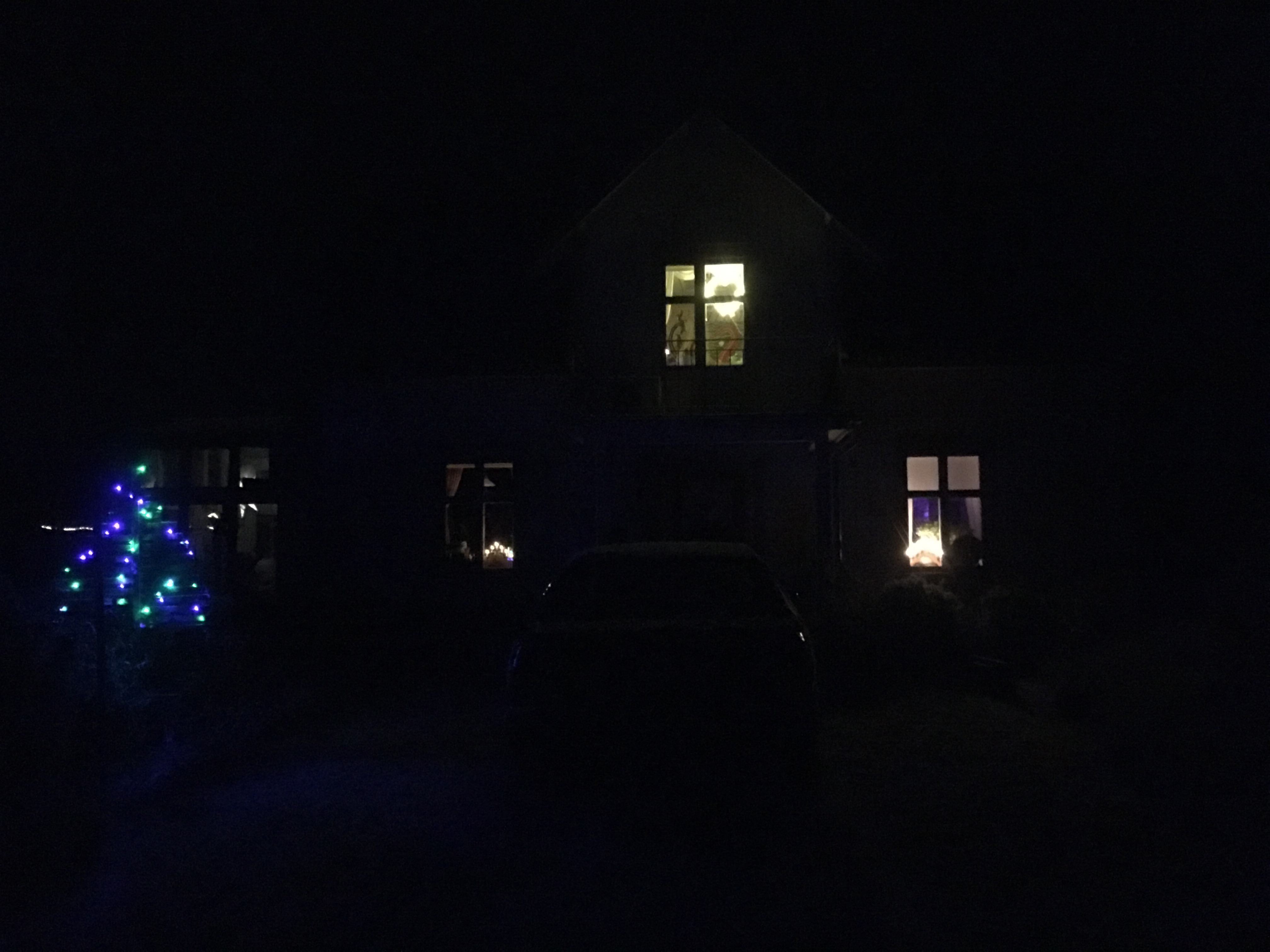 Vi, som håller låg julprofil, även vi trillar dit. Så utanför vårt hus i den nordiska Svarta midvinternatten står en blå-grön-röd-lila-gul gran och blippar…